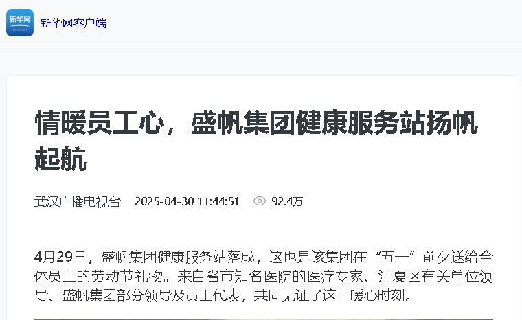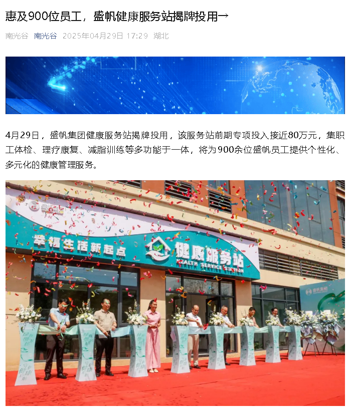4月29日,伴著濃濃春意,盛帆集團(tuán)在盛帆工業(yè)園內(nèi)隆重舉行健康服務(wù)站落成剪彩儀式,來(lái)自知名醫(yī)院的醫(yī)療專家、武漢市江夏區(qū)···