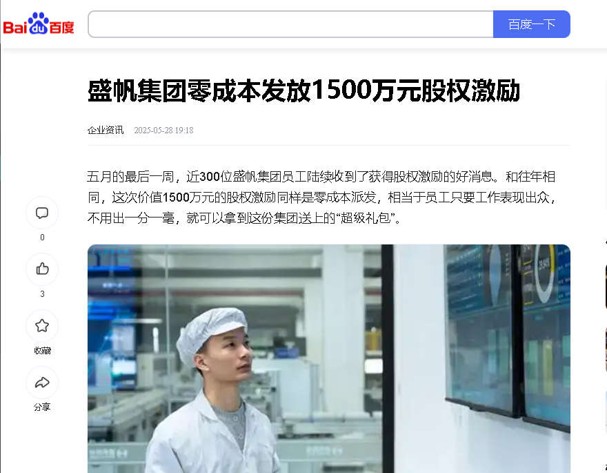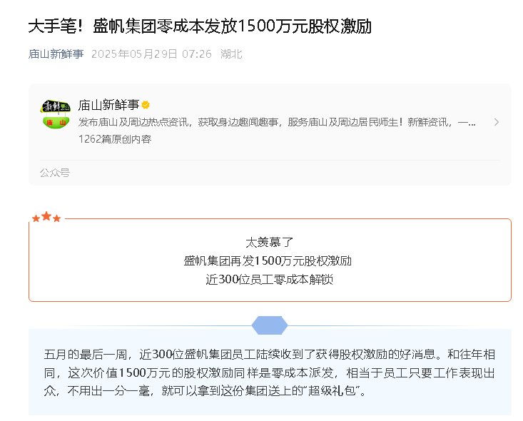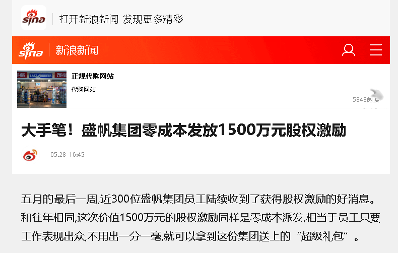 五月的最后一周,近300位盛帆集團(tuán)員工陸續(xù)收到了獲得股權(quán)激勵(lì)的好消息。和往年相同,這次價(jià)值1500萬(wàn)元的股權(quán)激勵(lì)同樣是零成···