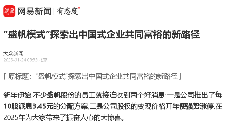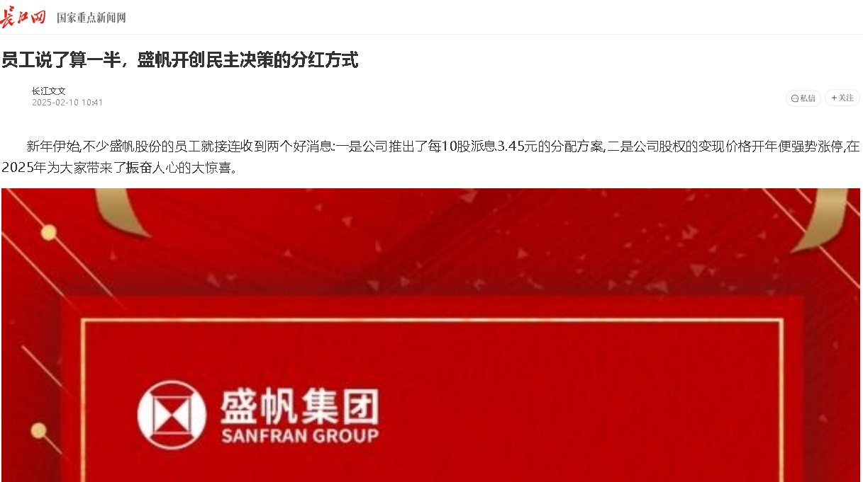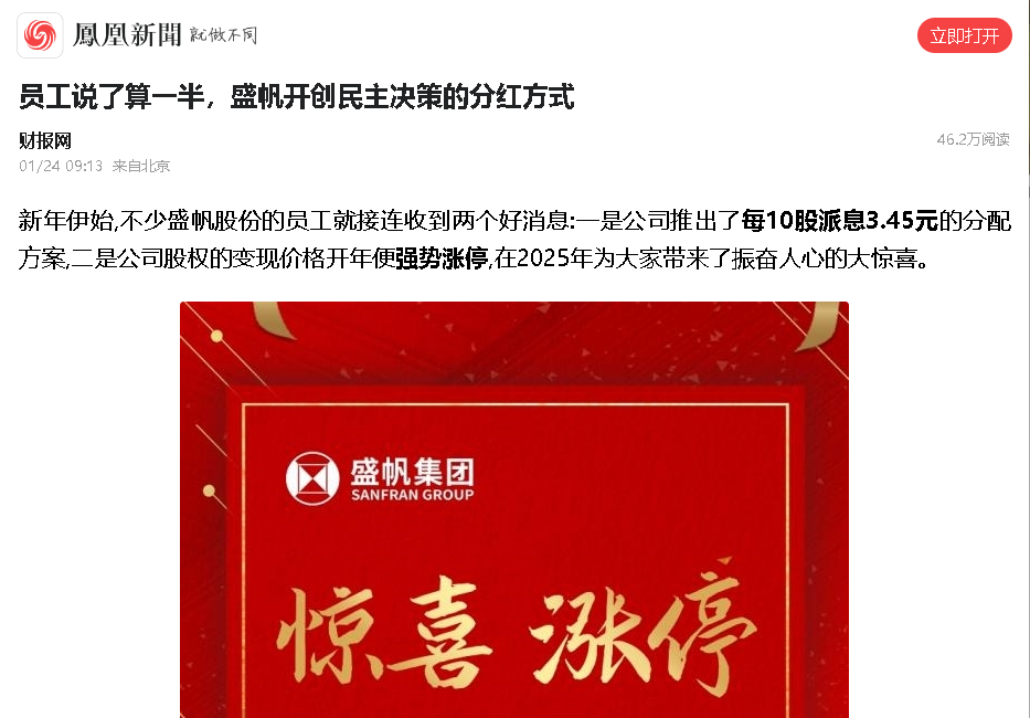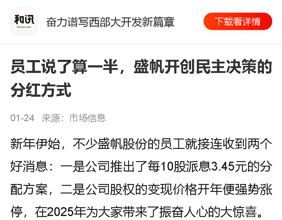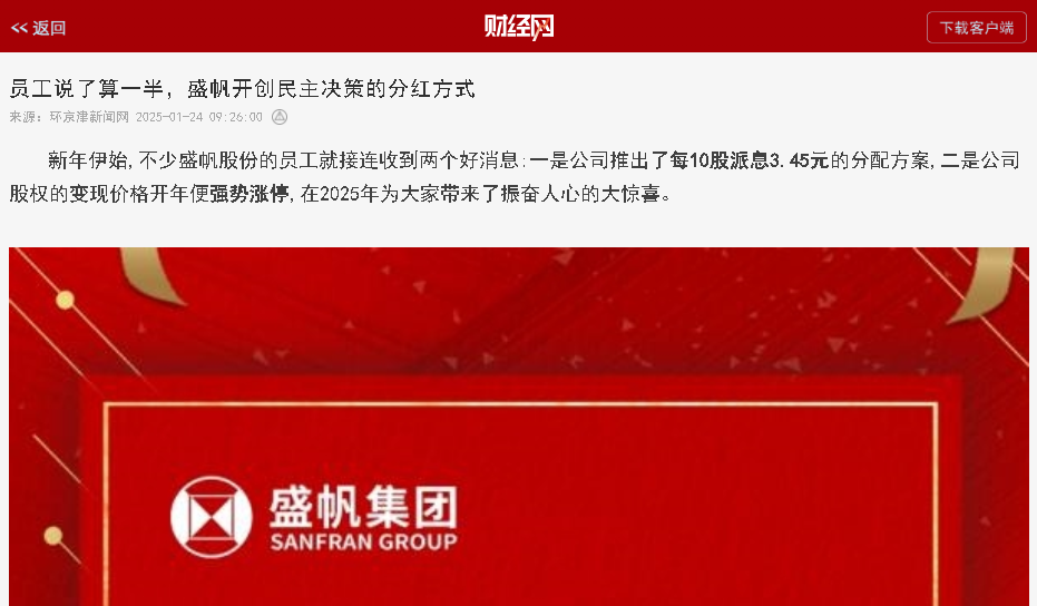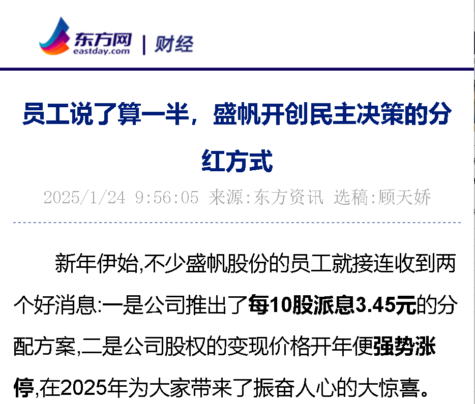 新年伊始,不少盛帆股份的員工就接連收到兩個(gè)好消息:一是公司推出了每10股派息3.45元的分配方案,二是公司股權(quán)的變現(xiàn)價(jià)格開···
