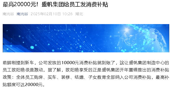 前腳剛提到新車,公司發(fā)放的10000元消費(fèi)補(bǔ)貼就到賬了,這讓盛帆集團(tuán)制造中心的員工歐陽艷很是激動(dòng)。據(jù)了解,歐陽艷享受的···